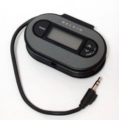 呵呵,赶紧copy了几个G的歌曲上去,然后出门去顶好电子市场给配了个硅胶套(60块),贴了个保护膜10块,然后思量再三买了个FM发射器,这个东西的作用是什么?就是能把MP3的音频通过FM发射出去,这样车载的收音机就能接受到音乐了,嘿嘿。就是这个东西了