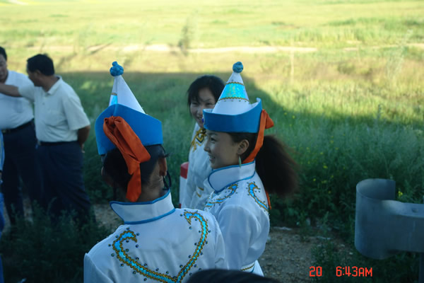 哈达是蓝色的,蓝为尊,象征着人们的生活像蔚蓝的天空。这位唱歌的姑娘给我很深刻的印象,她是典型的蒙古人种,脸颊宽、鼻子扁,草原的强紫外线让她的肤色有点暗透点红,比后来看到的歌舞团的蒙古姑娘显得更健康纯朴。