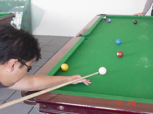路过宛平休闲室,里面只有简单的两张台球桌,同行的哥们技痒难忍,于是我们玩了几局,老板也很实在一块钱一局,还在边上给我们两个不咋的指点。