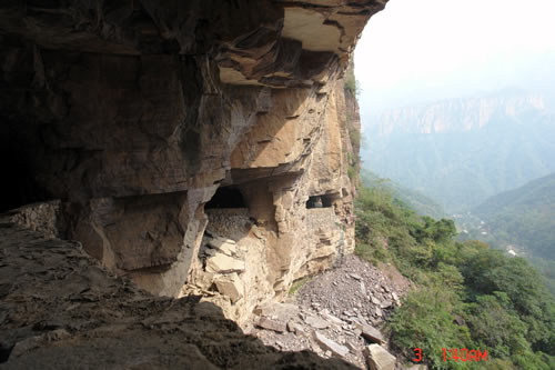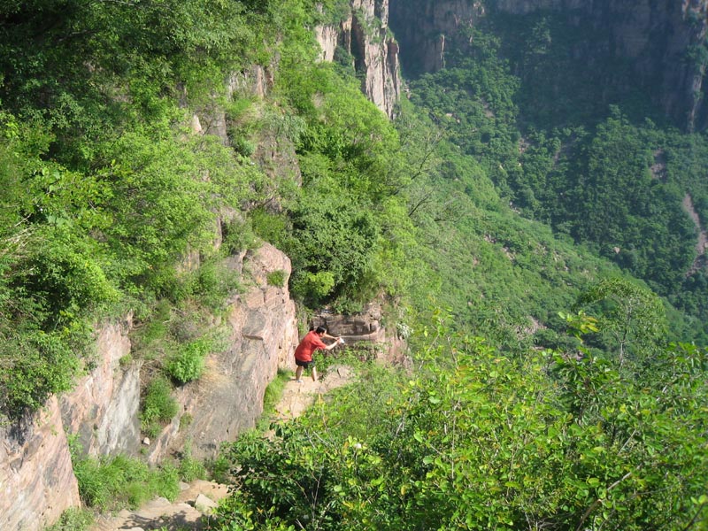 凿出郭亮洞之前,只有一个悬崖边上的小路,名曰天梯,最窄的地方只有40厘米,所有的生活用品都要从这里挑上来,以前有徒步驴友从这里爬上来可以省下门票,但是现在下面的西梯村也有人把守了。