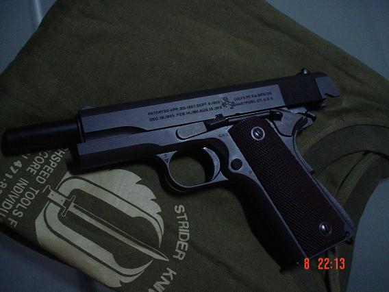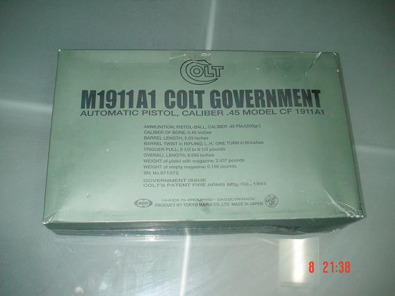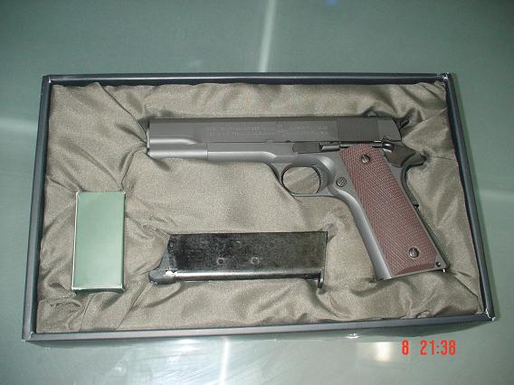 过了很多天的无聊日子,加了好多天的义务班,憋死了,某日拉上朋友出去遛弯,突然咯登一下,又压到了什么东西和某次无比的相似,下车一看,一个牛皮纸盒子,扁了一块,本想不管就走了,但是朋友还是拿起看看,哦,里面还有东西,拿上车一看,里面还有个绿色的纸盒子,上面居然写着M1911A1 COLT字样,