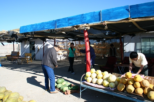 狂奔了近200公里,昏昏欲睡之时,出现了一片绿洲,路边马上出现了瓜摊,赶紧下车,红囊瓜吃到黄囊瓜再吃白囊瓜,很甜,顺便买了点瓜干回来,瓜干吃一条就行了,甜的发腻了,就像小时候用塑料袋换的糖。