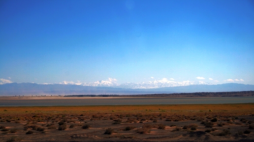 还是路上的景观,最远的是雪山,中间有个很少见的湖,近处是戈壁滩