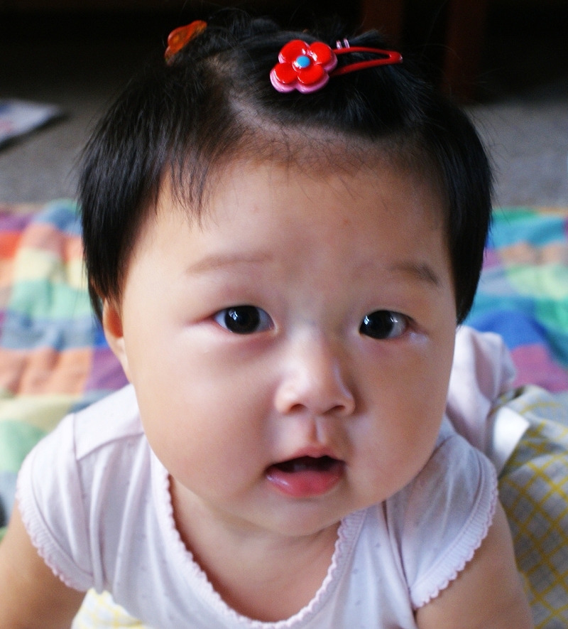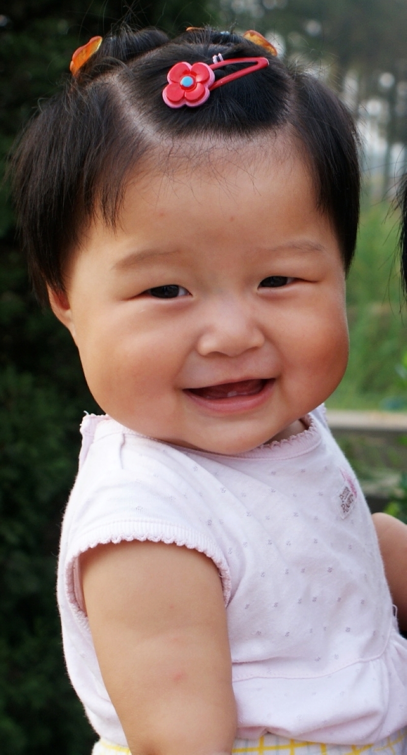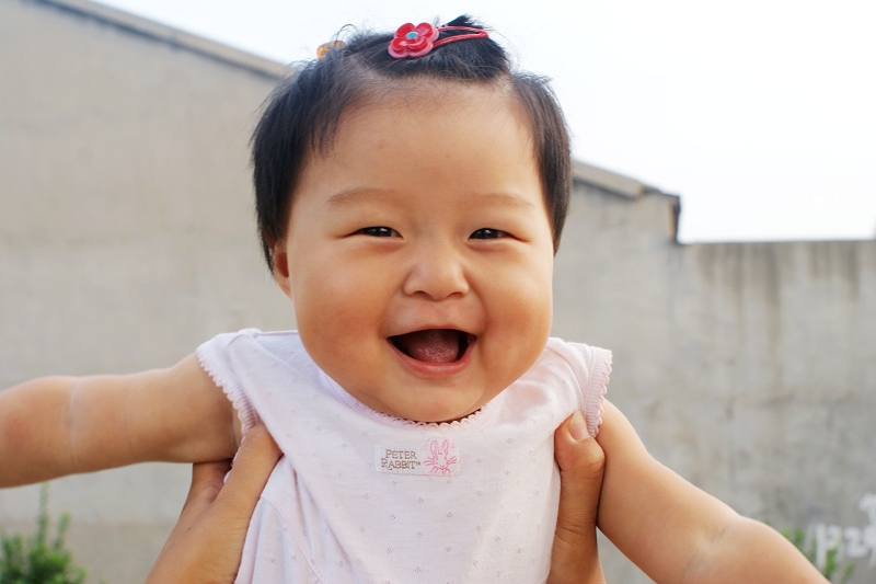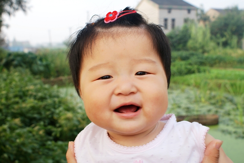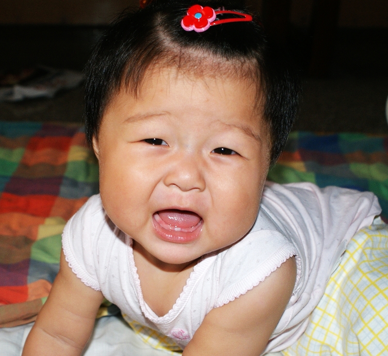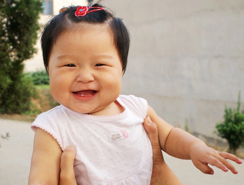 啰爸只顾拍照不抱她,她有意见了,一张嘴,露出长了一个多月的一颗小乳牙。