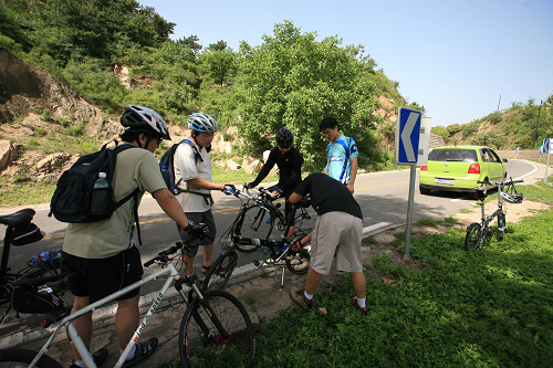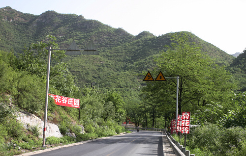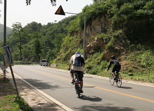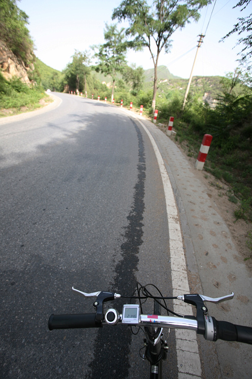 放坡非常爽,风声和链条齿轮的声音相当悦耳,可惜不能拍照,这段放坡的路我终于能和牛人们并驾齐驱了,哈哈,这是我前面艰苦近2小时爬坡的奖赏。到黄花城下,我又落后了,凭着当年开车来的印象我走了另外一条路,比其他人多走了3公里