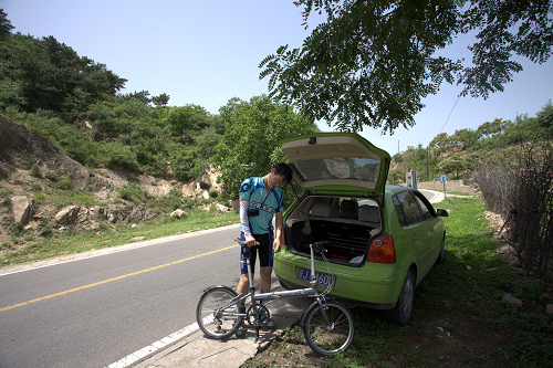 因为17-40L到手,周末想出去玩玩,本来想忽悠别人陪我出去玩的,结果被人忽悠骑车去黄花城,前年买的大行折叠自行车,到现在里程总共不到300公里,胎毛还在上面,晚上问人出去骑车吗,答曰,去啊,你来不来。本来我的意思我开车当后勤车完了,结果,老婆也去,我就成了骑车,她当后勤车司机了。硬着头皮答应下来了,早早睡下,第二天5:30起床,wk,今天我起得居然比豆豆早啊。