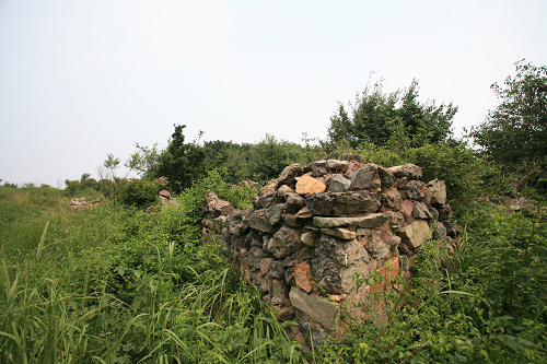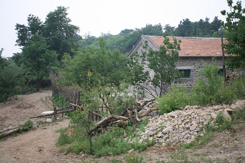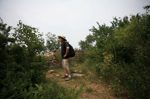 走到一平地,检查GPS到了大风口,碰到几个从大觉寺过来的老人,居然还是背的很大的背囊,告诉我顺着这个小道就能走到妙峰山了,一点也不难走,次此话给我很大的鼓励,停下吃包子,喝水抽烟补充盐分。11点20出发,进小路前被遗弃的石屋,一路上能见到很多