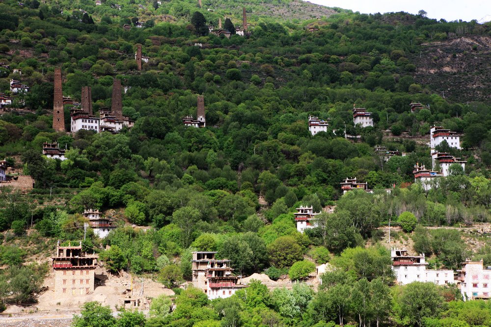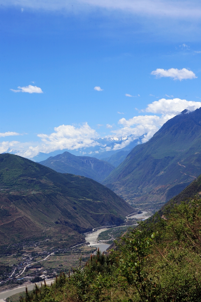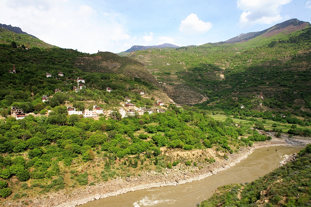 出了山洞仔细辨认去丹巴的路牌,但是前面好像没有路都是乱石堆,犹豫的时候后面出来了当地车毫不犹豫地向中间的乱石堆扑了过去,我也毫不犹豫的跟了过去,过去拐弯一看真对了,下面的100多公里路有泥路,碎石路,搓板路,塌方路段,甚至还有过水路面,我的鞋全湿了,累的不想拿相机也不想下车,一路麻木的沿金沙江峡谷北上,突然左边出现了一个破碉楼,精神一震,拐过弯右边的江对岸出现了更多的碉楼,然后看到了路牌,丹巴县城还有3公里,老天终于到了。