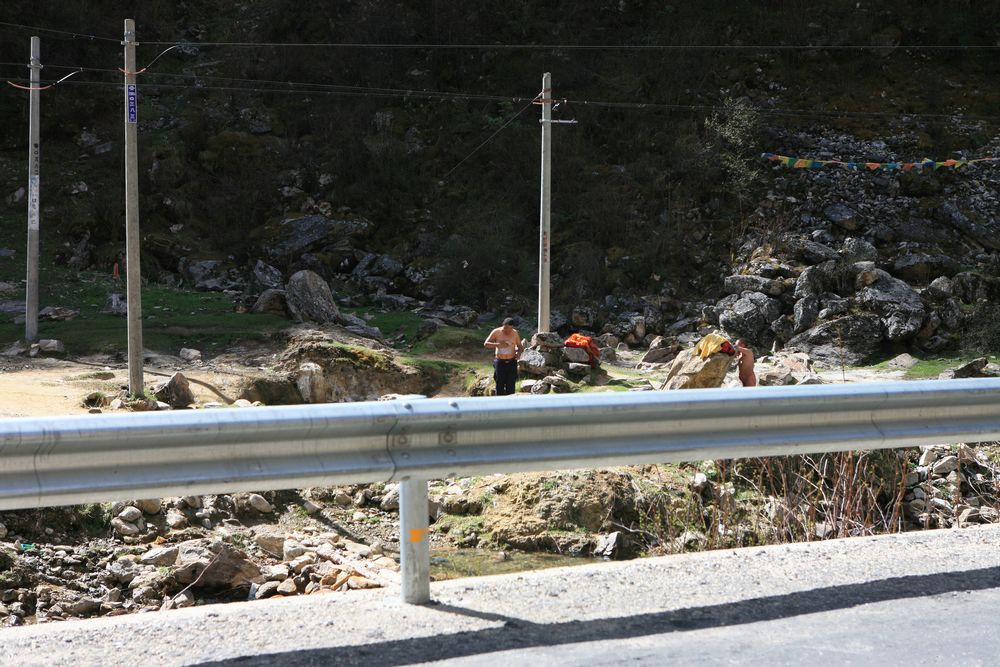 边上的藏民是从丹巴来的在对面的山洞里住了20多天,有二十多个人,每天就在这里泡温泉晒太阳,他自己说安逸哦,这三个词好像藏民也说得很顺溜,他希望我到西宁后把摩托车卖给他,嗯他知不知道西宁在什么地方呢?我给他分了巧克力,他不吃给了孩子。