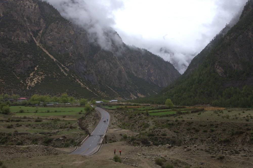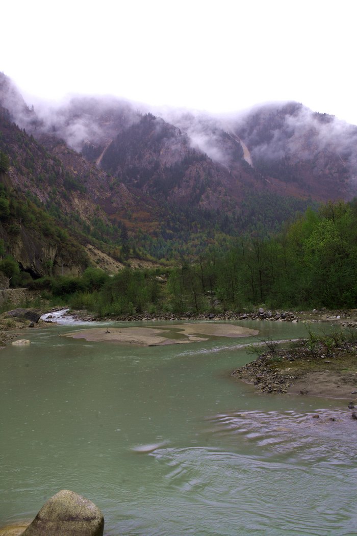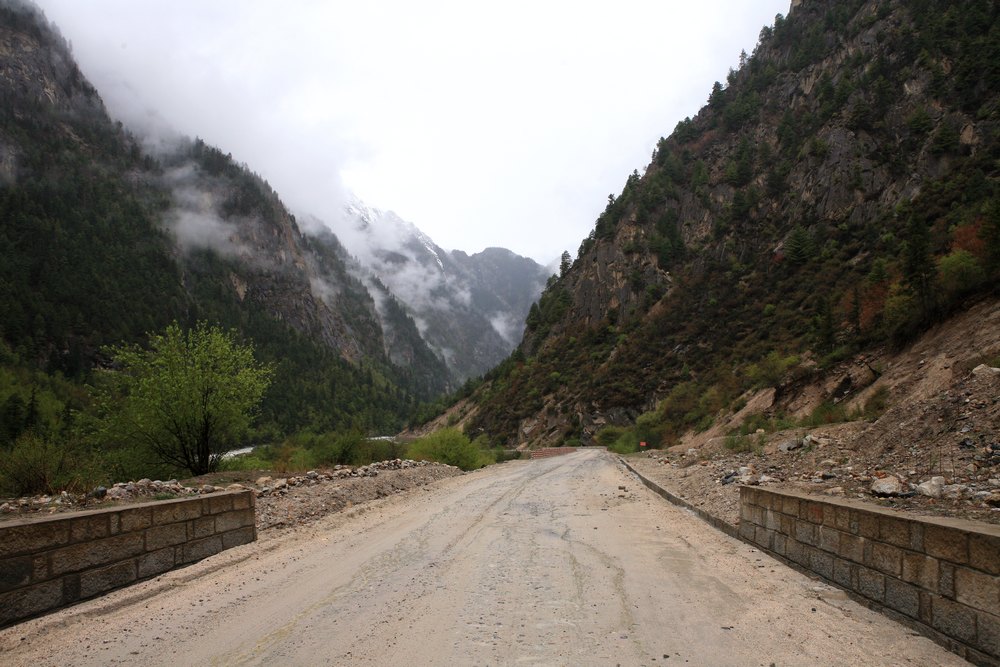 然乌湖湖水居然是浅绿色的,配着白色的雪山非常好看,一路沿着湖水往西走,雨下的越来越大,我开始后悔托大了,只穿了骑行服,没有把雨衣套上,登山鞋里已经湿透了,换档的时候能感觉到里面水在晃荡,然乌到波密的这130公里比任何一个200公里都显的漫长,我在祈祷,波密的路牌早点出现,4个小时的路程,身上基本湿透了,手冻得没有知觉,我这次最失败的装备是这副防水手套,以后我会专门出一个装备总结说明一下的。