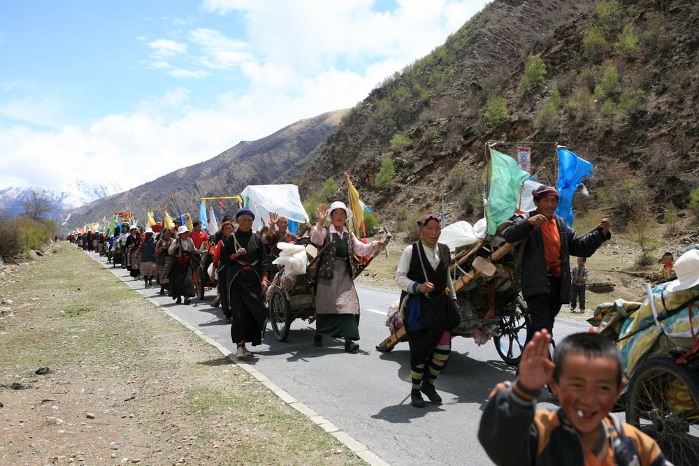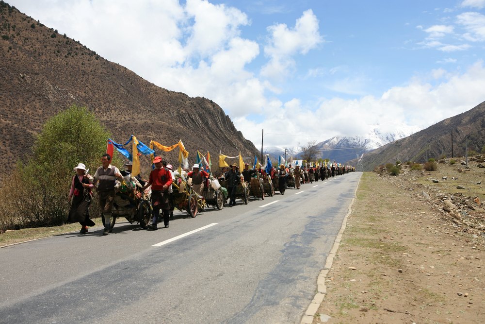 超过一群磕长头的,远远又看到一条长龙,加油超过,停下拍照