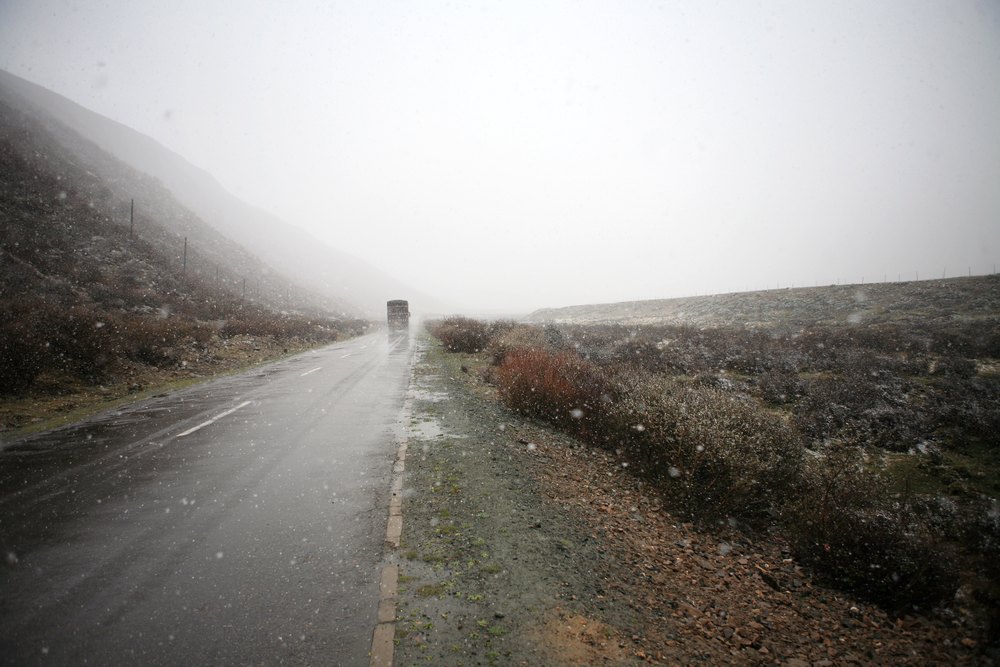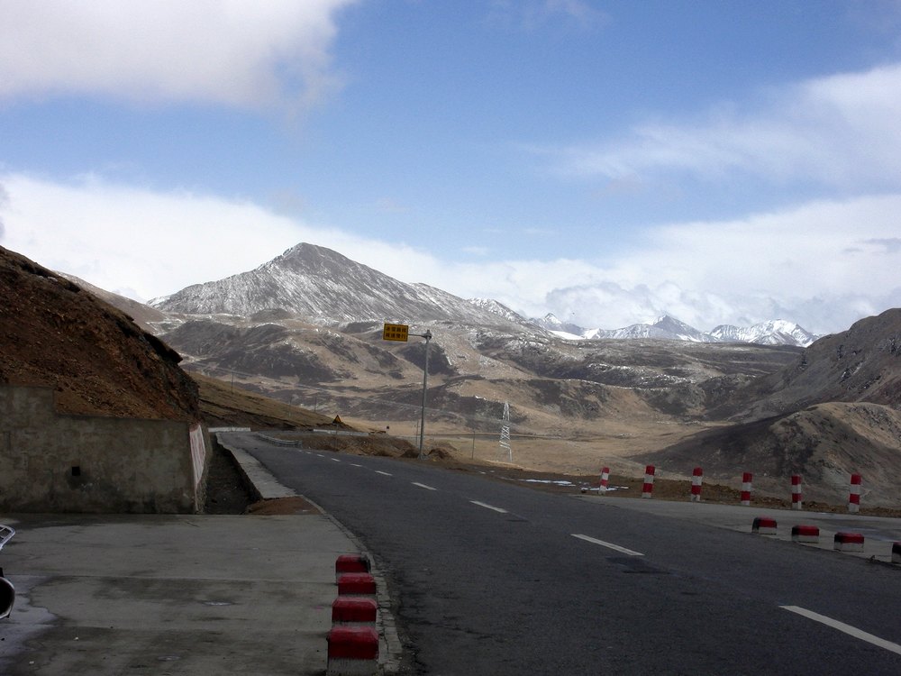还是远远的眺望米拉山,我相信过了米拉山肯定是晴天,忍住寒冷,爬上米拉山,这是川藏最高的山口,往西望去,真的是有太阳啊