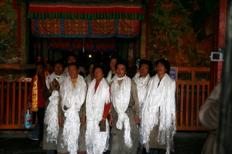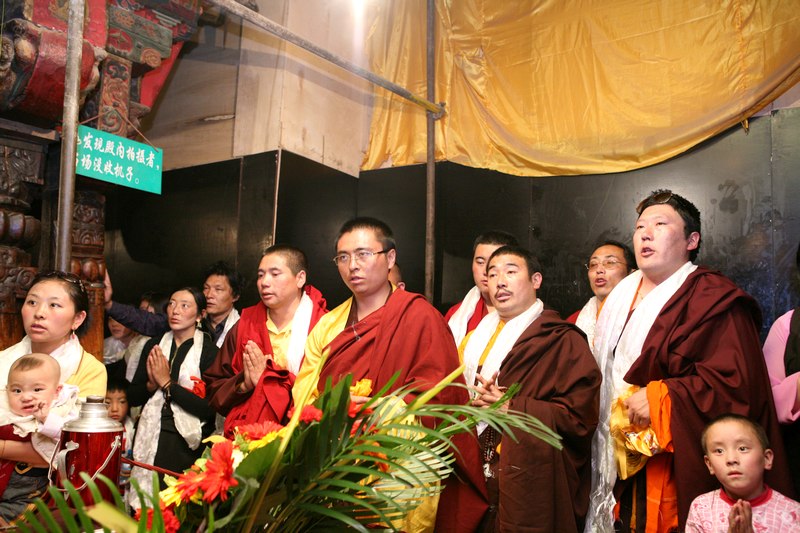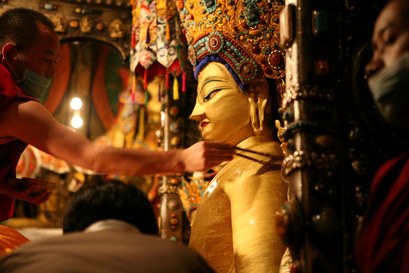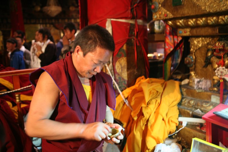 刷的同时,活佛带着带来的僧人在外面念经,朝拜的藏民见了也一起唱,很好听呢,有了拍照特权,我俩一顿拍,我的外闪太亮了,引起了寺内管理人员的不满,一再警告,拍几张做纪念就行了,不要一直拍,还一直怒视我们跟着。我们俩也得到了一小瓶子的佛脸上刷下的金水和2块佛衣碎片做纪念,这玩意一般游客是得不到,呵呵,二进大昭寺很值啊。