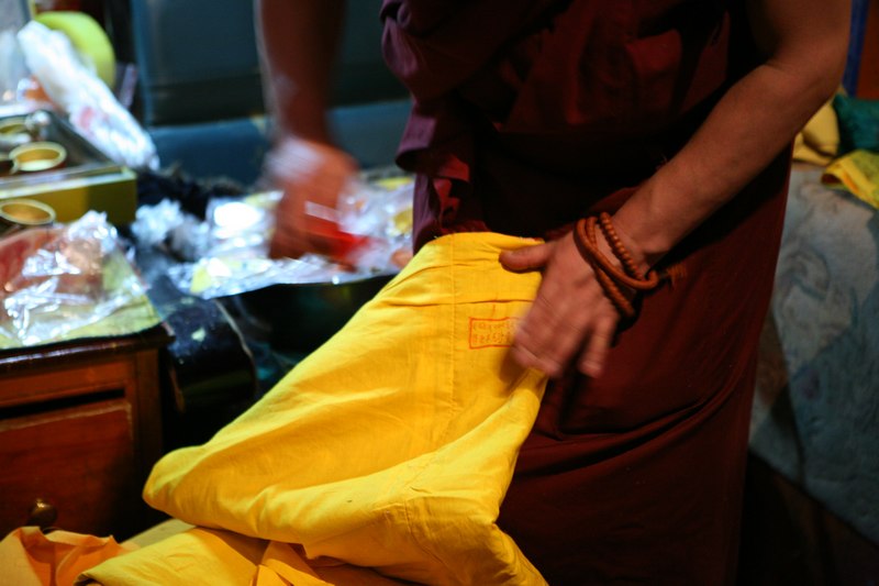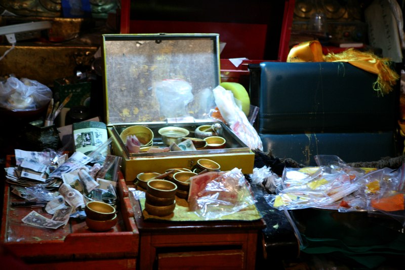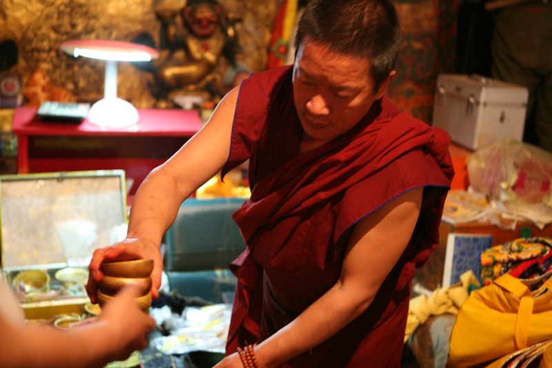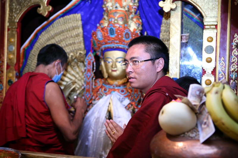 比较失望的回宾馆,回到宾馆。晓宁有个好消息,说是在火车上认识的一位住北京的XXX基金会的藏族人要去大昭寺给释迦摩尼上金身,邀请我们一起去,更重要的是能在里面拍照,哈哈,这是要花几万块才能得到的机会啊,吃完饭,涛哥还是高反不去了,我和晓宁走到广场,发现这位扎西同志穿了喇嘛的红袍,外套一件黄色的马褂,一问才知道黄色的马褂只有活佛才能穿的,那扎西居然是个活佛,管了四川甘孜地区2个寺庙的小活佛,转世灵童。等待上金身的时候见到了同样来自甘孜的法王,活佛见了法王也要毕恭毕敬的,据说管了一个大寺庙和很多小寺庙,很多藏民见了法王都要他给摸顶,我差点忍不住也让他摸一下。不过寺里的保安好像不管法王活佛,一视同仁,让法王走哪里他就要走哪里。