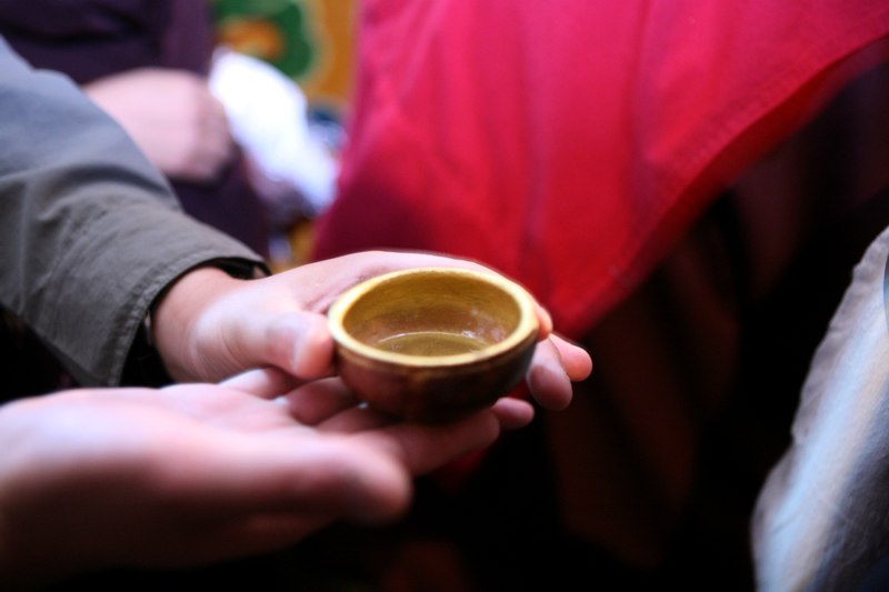 刷金身的过程就是,把外面买的金块给寺里的僧人,僧人放在小碗里加进开水,捣成金水,拿出件佛穿的衣服,盖上章,然后到庙堂里由专门的僧人给佛刷上金粉,穿上新衣。