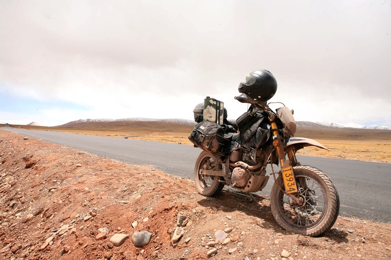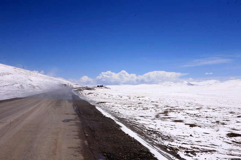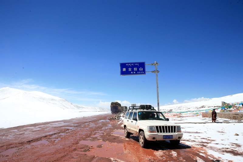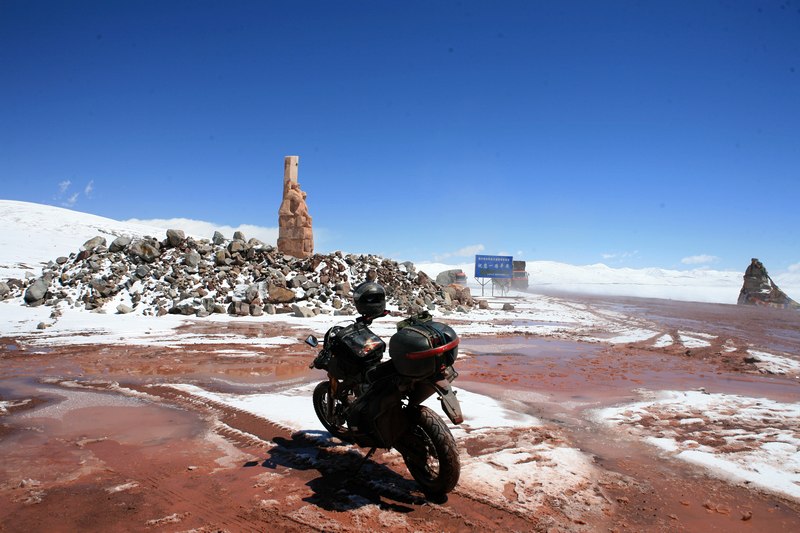 快到唐古拉山,我记得纵横那辆摔倒的非双750,还有他面颊骨折的主人,就在这里因车速过快摔倒的,放慢车速,超过因为晚上下雪而堵在这里的卡车队。远眺唐古拉山口,一排排黑色的像城垛一样的黑色方块在路上,直觉告诉我那是军车队,走近了,果然是,缓慢的超过停在一边的民用车辆,柴油发动机喷着黑烟拼命往上爬,我罩上口罩,找空隙一辆辆的超越军车,直到被某士官拦下,等车队大部分过了,士官也跳上某辆车走了,我和一辆昨天也从纳木措出来的奔驰越野车一起冲了上去,唐古拉山上下这段路实在烂,冰雪融化后的红色泥浆溅的我和三狗子身上都是,我开始庆幸我早上穿上了雨鞋和雨裤。