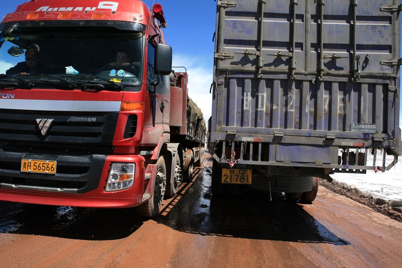 前行没多久,遇上堵车,过了这辆车就彻底被一辆平板车拦住了,下车看看边上的路基很软,我的滑胎估计也下不去