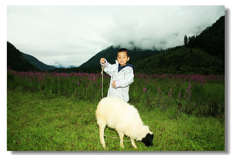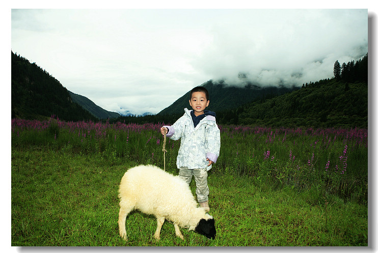 进入九寨沟县,路边的一片薰衣草地,豆豆放羊