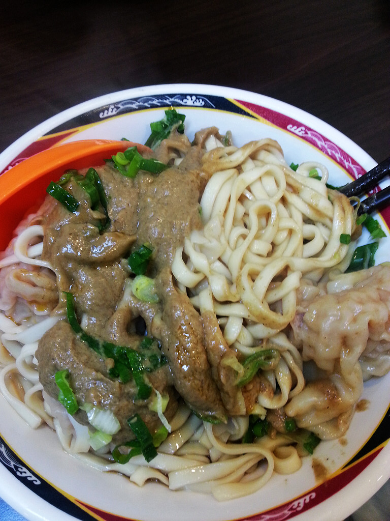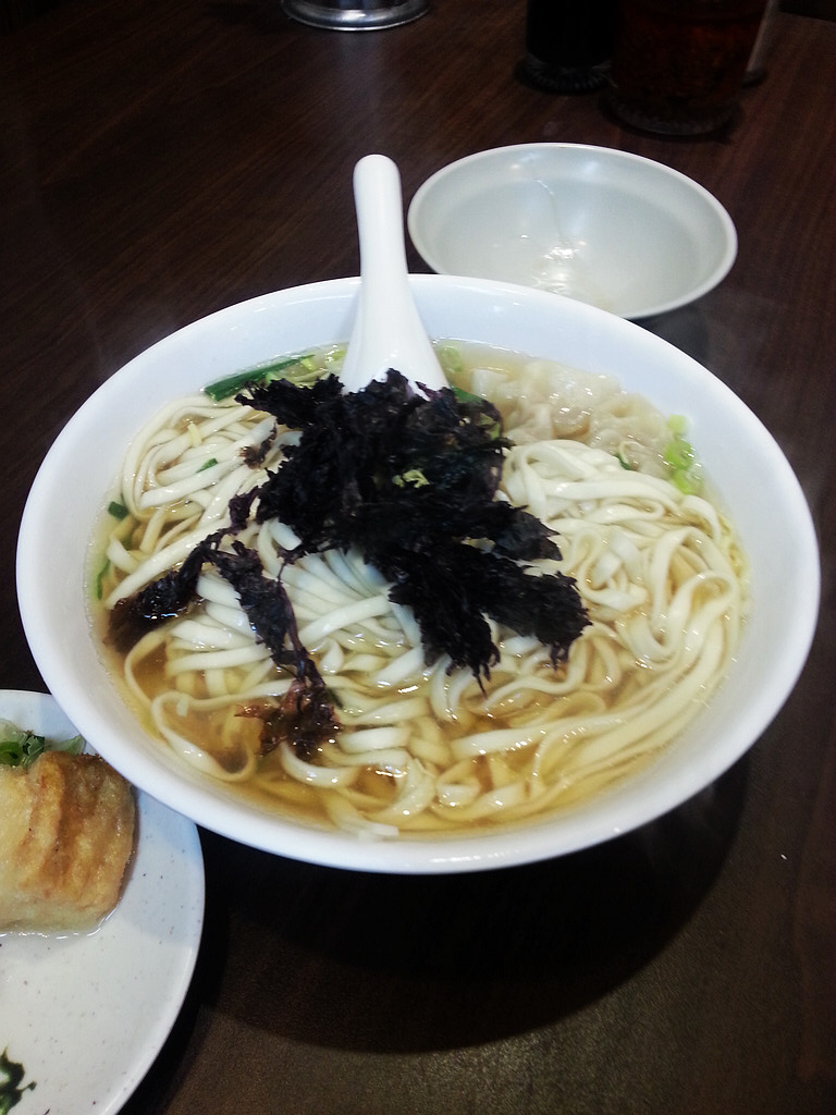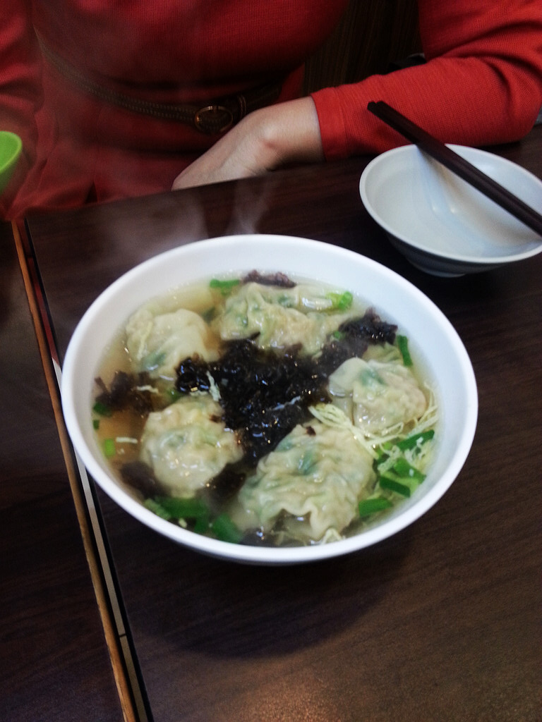 溜达几步看到一个小吃店,温州大馄饨,店里只有2个低头看报纸的本地食客,我们3人进去,头也没抬,点了3碗加几碟小菜,算成人民币真的很便宜,一碗才10几块,据说温州大馄饨的辣酱有名,我忍不住多吃了几口,果然不错,带点甜味的香辣酱。