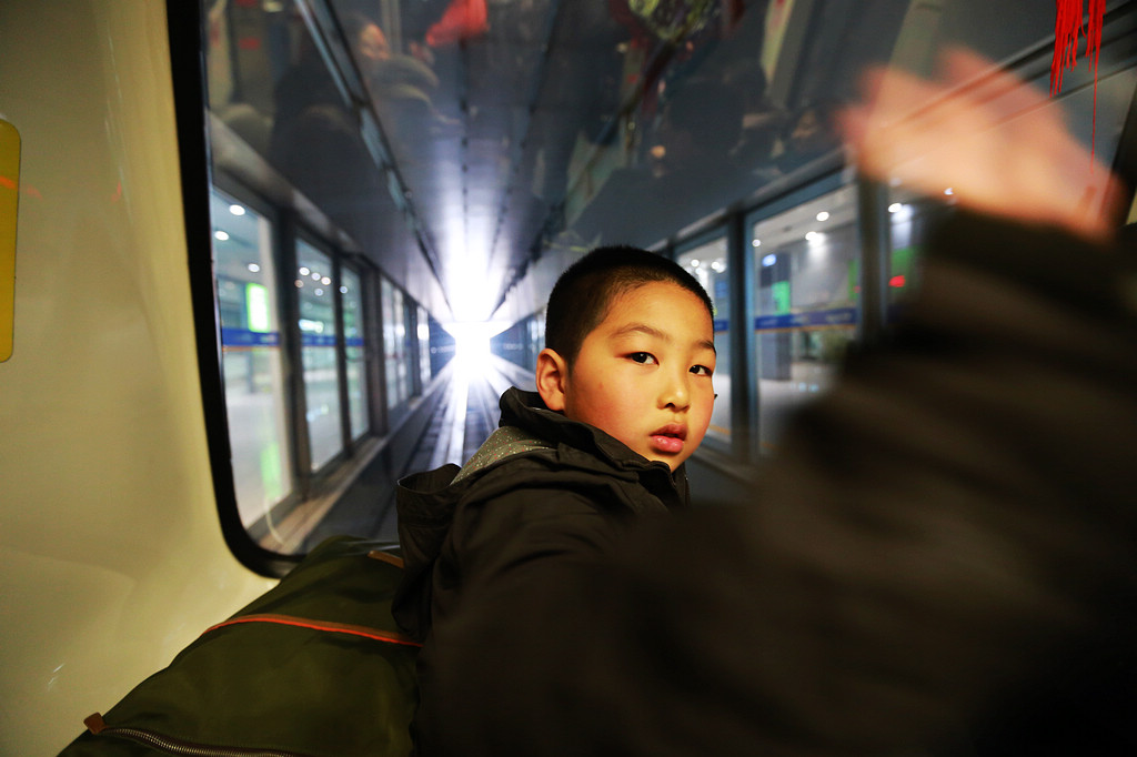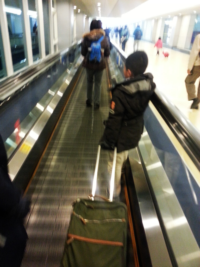 T3还要坐一段有轨车才能到国际出发站,豆豆大了,好处是不用背了,另外一个好处是骗他要废点脑子了