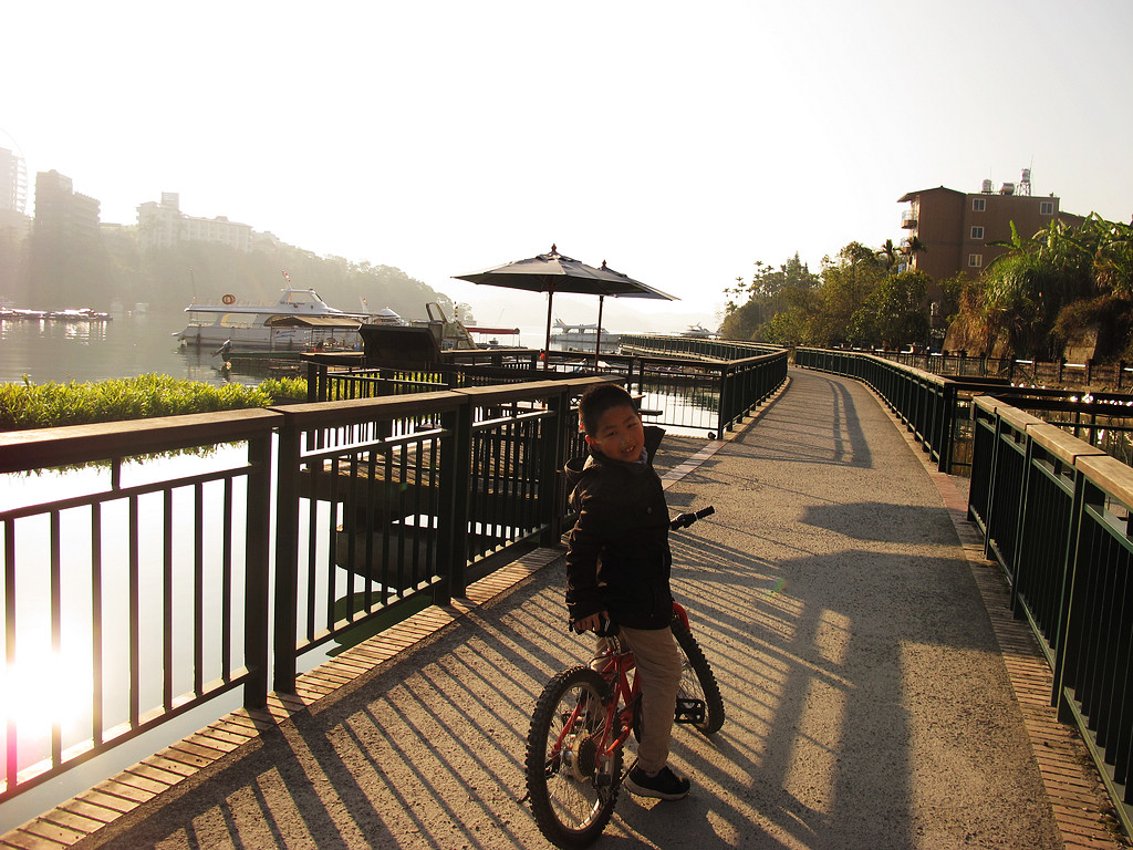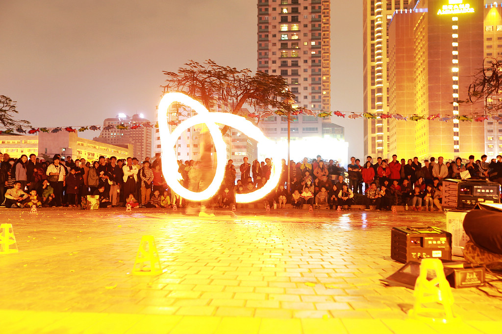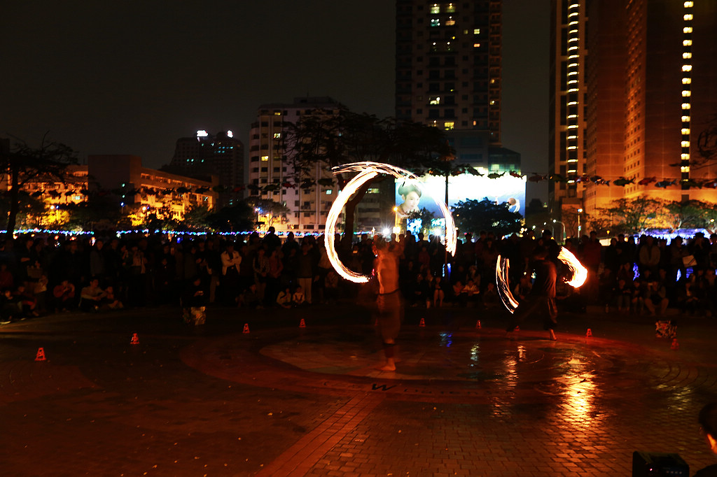 一如既往的不吃饱,继续沿爱河找真爱码头,越走人越多,直到碰到了进行交通管制的警察,询问,原来爱河边一会要有焰火预演,河边都是来看烟火的人群,我们骑车走自行车道毫无障碍的前行,直到被另外一群人吸引住,这里是某团体的街头表演,我一直想不明白,这火是怎么能被咬在嘴里的,又怕豆豆回去学着干,忽悠他,这是种低温火,不是普通的火。