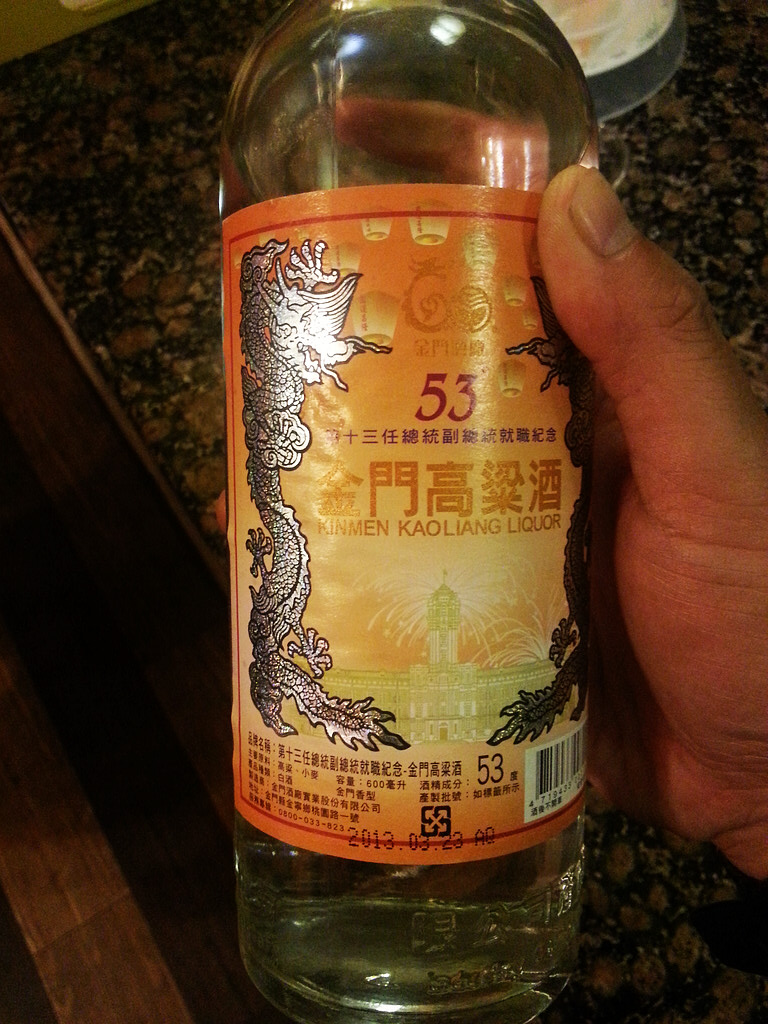 回到民宿,豆豆找书坐着看,我就和老板聊起来,从他满吧台的威士忌和白酒瓶子开始,老板也喜欢威士忌之类高度酒,啤酒喝了肚子胀,说到兴起,老板起身,翻柜子,说我们干脆喝点吧,找了一瓶53度的金门高粱后来我在机场就是没有找到这种53度的金门高粱,常见的只有58的
