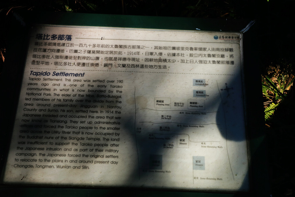往上走便是白杨步道,不过年久失修,立了指示牌,建议游人不要通过,我不是游人,直接上去了,陡峭处需手脚并用,边上只有铁链扶手,有点像华山,攀爬5分钟,到了塔比多部落原来居住地,100多年前塔比多部落居住于此,看地形真不错,俯视文祥平地,易守难攻,边上还有立雾溪水源。直到100年前日本军队发动太鲁阁战役,将部落人强行迁移到山下。