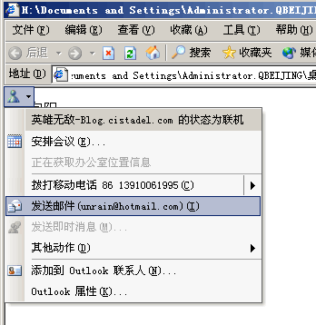 今天在某人的Blog上看到一段代码,作用是什么呢,我们知道在SharePoint中,当鼠标移动到某个人的名字上的时候会弹出一个菜单,我们叫它“Name Menu”,包含了AD,OutLook,Exchange等信息。现在我们也可以在非SPS的环境下使用这个“Name Menu”,前提是你安装了Office2003,下面就是这段代码的效果。