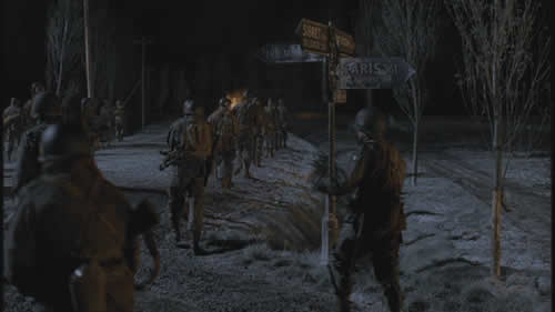 最后一幕是德国人开始了著名德阿登反击战,盟军全线溃退,101师这个时候却被调上前线,驻守Bastogne附近的森林,没有足够的御寒服装作战装备和食物,下一集说的就是在Bastogne度过德漫长的冬天。呵呵,“伞兵生来就是被包围的”。