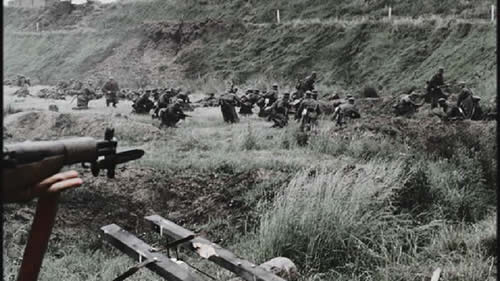 Winters冲上堤坝一人就开始朝一堆党卫军开火,加兰德步枪是二战中唯一一款半自动步枪,8发容量,Winters一发一发射击,德军的98k虽然可以说是二战中最好德后部旋转步枪无奈是手动的,乱作一团中,E连的士兵赶到,一起打靶一样射击。